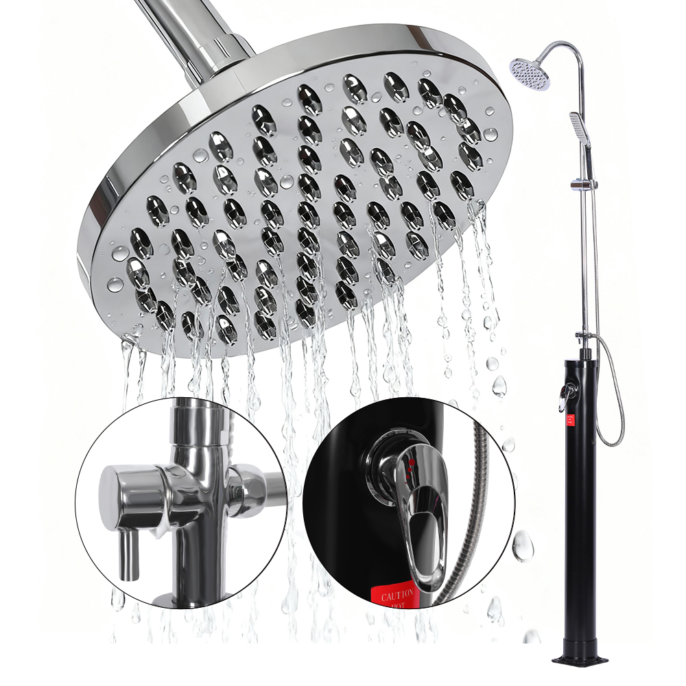 LY08L03 8L ulkopuutarha-altaan aurinkosuihkussa on yksivipuinen hana, joka säätelee tarkasti veden lämpötilaa sekoittamalla lämmintä vettä suihkuputkesta kylmään veteen puutarhaletkusta. Se on varustettu puutarhaletkuliitännällä kätevää täyttöä varten ja tyhjennystulpalla, joka mahdollistaa täydellisen vedenpoiston turvalliseen talvisäilytykseen. Rakennettu tukevalle ruostumattomalle teräspohjalle vakauden takaamiseksi, suihkun yksittäiset osat on kiinnitetty tiukasti ruuveilla ja se on ankkuroitava maahan turvallista käyttöä varten. Käyttöohjeet ovat mukana ja saatavilla useilla kielillä.